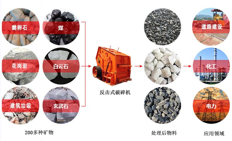 通常情況下,反擊式破碎機不單獨工作,與振動喂料機、顎式破碎機、振動篩、皮帶輸送機、集中電控柜等設(shè)備可組成成套石料生產(chǎn)線。