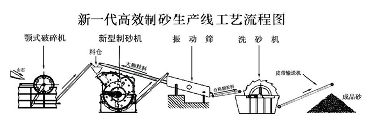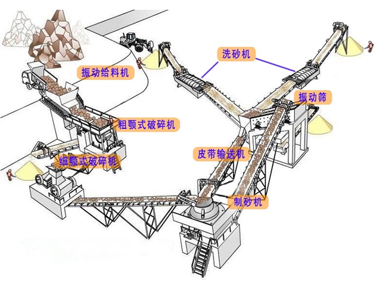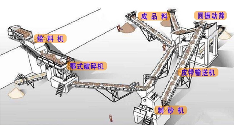 石料通過振動給料機均勻進入粗顎式破碎機進行初步破碎,產(chǎn)成的粗料由輸送機輸送至細碎機(可選配重型制砂機或立軸制砂機)進行進第二步破碎,細碎后的石料進振動篩篩分出各種規(guī)格的沙子、石子;然后進入振動篩進行篩分,滿足客戶要求的通過輸送機輸送至成品料區(qū),不滿足要求的重新進入制砂機再次破碎,終產(chǎn)出符合要求的各種砂料(人工沙生產(chǎn)線)。